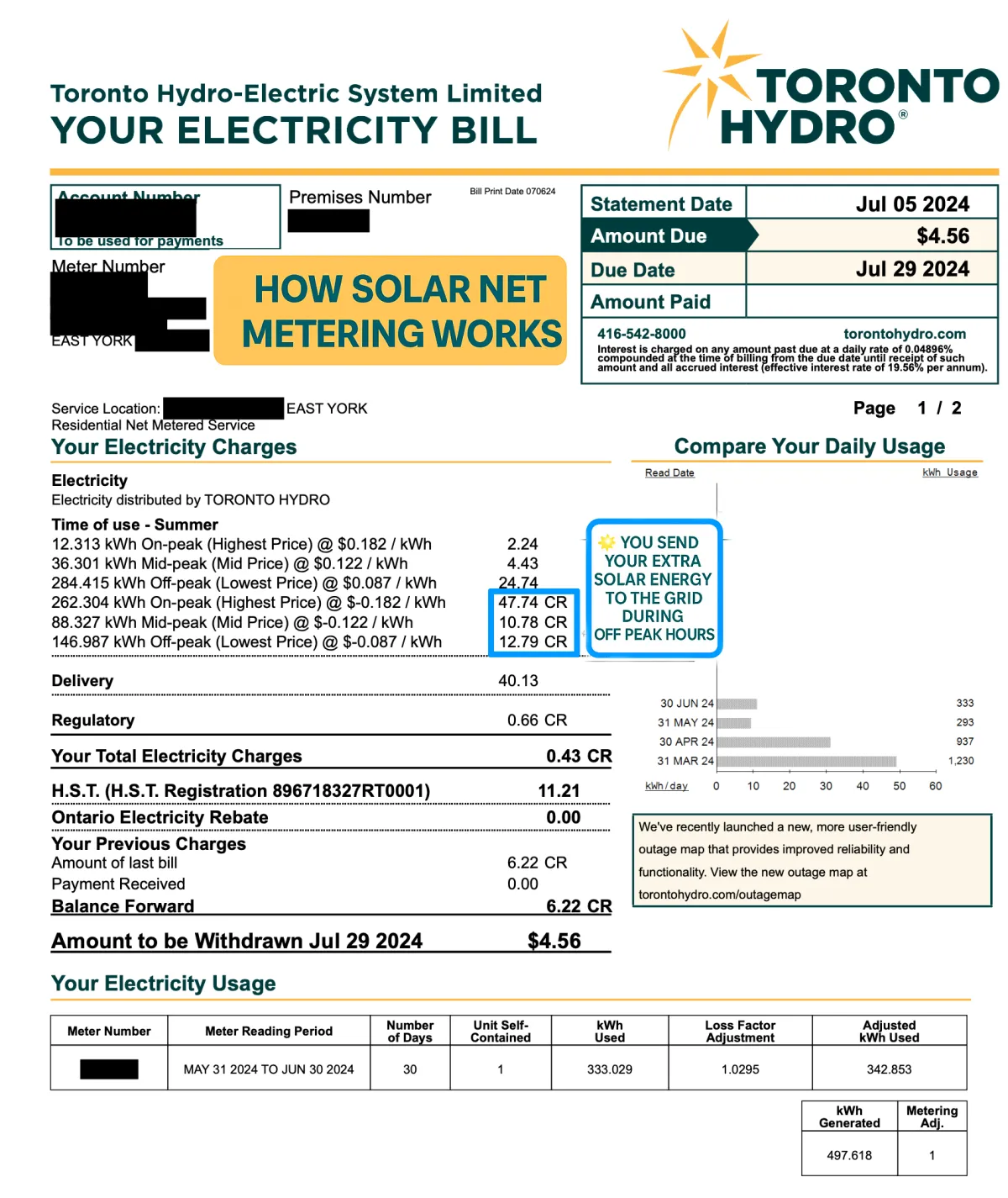 Net metering allows you to send excess electricity you generate from your solar panels to the distribution system for a credit toward your energy costs. In essence, it’s a “trade” of electricity you supply against electricity you consume. The Net Metering program gives GTA homeowners the power to better manage energy costs. When you’re producing more renewable electricity than you can use, Hydro will take the surplus supply back to the grid. In return, the utility will give you a credit on your bill to help pay for those times when you’re not generating enough power and drawing from the grid helping expedite the ROI for your solar system investment.